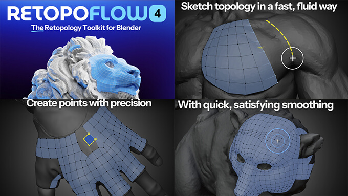 Blenderで2013年に開発が開始され、リトポロジーするな必須アドオンとして定番のアドオンRetopoflowですが、随時機能を追加してバージョンアップしたRetopoFlow4が正式リリースされました。
