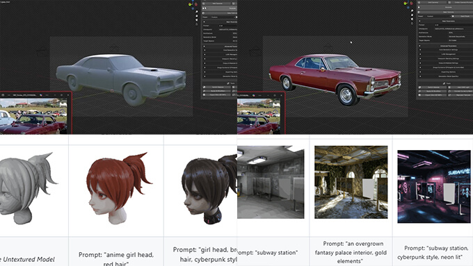 1つのメッシュだけではなく、カメラの視点からシーン内全てのメッシュに自動テクスチャを作成して、統一感のあるテクスチャを作成可能。既存のテクスチャ(StableGenで生成されたものも含む)を、画像から画像への変換プロセスを用いてスタイル変更、補正、またはディテール追加する事も可能です。