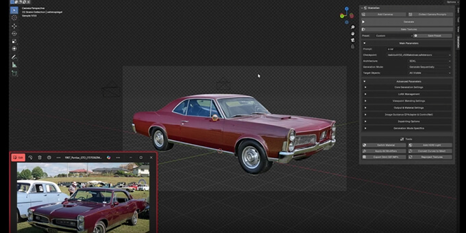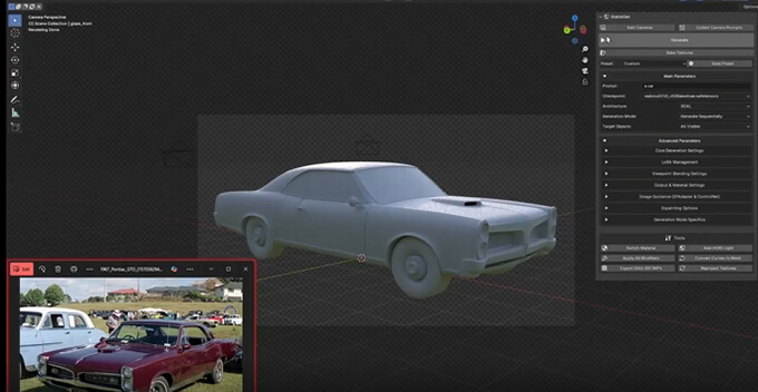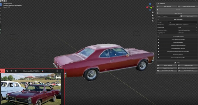 UVが無いモデルの場合はStableGenで自動展開を行ってから生成も可能。カメラ設定、テクスチャベイク、プリセット管理、詳細な AI テクスチャ生成のための高度なパラメータ コントロールが使用可能です。