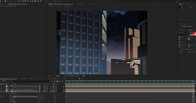 背景を描く際は、クオリティが高い3Dの有料素材を購入して工数を減らすテクニックを紹介していますが、全て3D内で思い通りの背景シーンを作ろうとすると大変になってくるので、素材別で書き出したものをAfter Effectsで合成して複雑で魅力的なライティングを作る方法も解説してくれています。