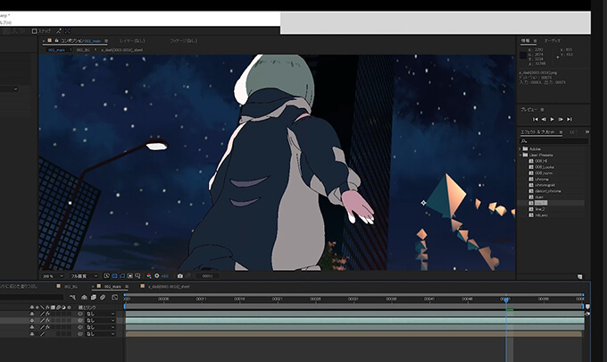 キャラクターの原画と背景が出来たらAfter Effectsに読み込み、キャラクターは視認性を良くして1カットの見栄えをよくする方がそのシーンがよくなること、レンズフレアをアクセントに入れたり、作りながらその都度調整して試行錯誤していく方法、出来上がった流れをみながら最後にキャラクターに目線が行くように画面の隅を暗くするエフェクトを入れる方法も解説。
