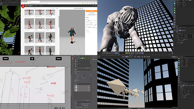 コンテを作る際は、Vroidを使って作成したキャラクターデザインに近しい物を作って、そのデータをMixamoに入れてアニメーションを付けてCinema4Dに読み込みアニメーションを付けて、どんなアングルで見せたいかコンテ用に簡易的にアニメーションを作って工数を極力減らしながら探っていく方法を解説してくれます。