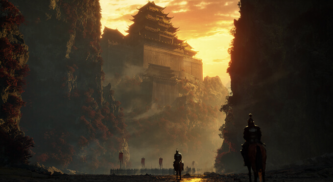 東洋的な美意識をもつ空間構築、風景画的表現と建築構造の融合(バーチャルと実在の要素を組み合わせる手法)、そして雲や霧のエフェクトを論理的に追加して、古代中国の戦場の壮大さを再現するプロセスに焦点を当てた作品作りを学べます。
