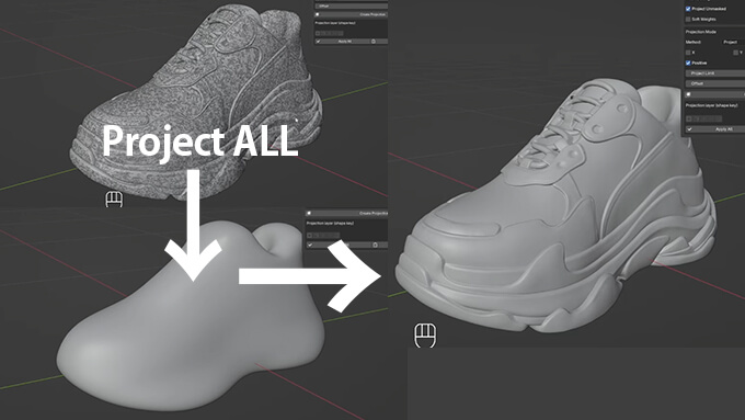 ZBrushの「Project All」に似た機能を持ち、高解像度スカルプトモデルのディテールを低ポリモデルへBlender内でワンクリック転送できます。