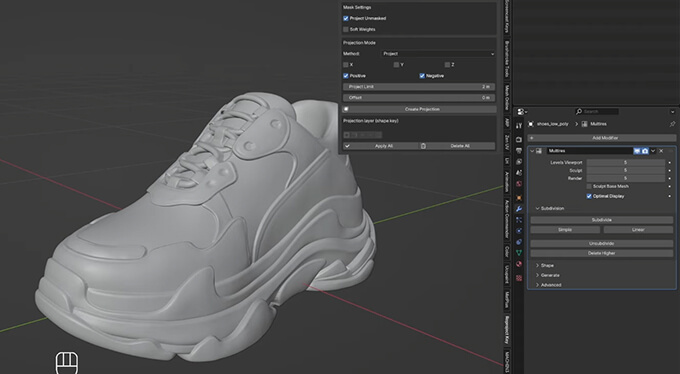また、ハイポリモデルの靴モデルを、ローポリモデルのマルチレゾリューションモディファイアーで細かくしたモデルを用意する事で細かい模様まで転写する事も可能ですが、マルチレゾリューションを使用している場合はShape keyが作成出されません。