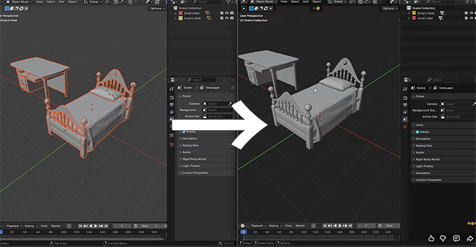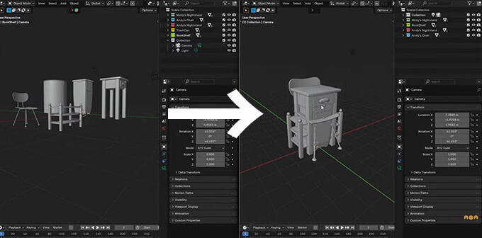 シーン間でコレクション単位のコピー&ペーストができ、Eeveeではシーン全体のマテリアルを一括オーバーライドすることもできます。加えて、左右対称モデルでポリグループを自動生成する機能や、他のシーンから読み込んだコレクションをグリッド上や中央に自動配置できる機能も用意されています。