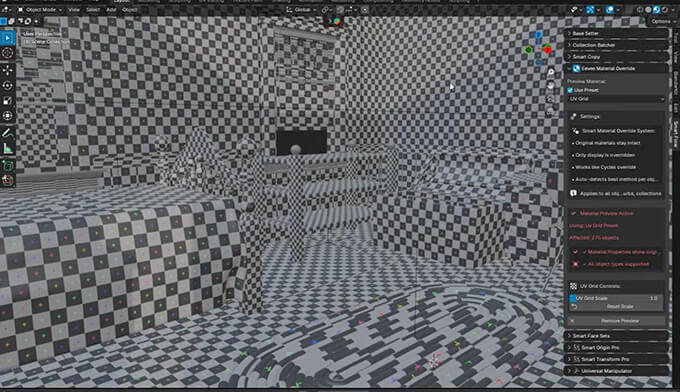 Eeveeレンダリングで1つのマテリアルで全てのモデルをオーバーライドする事が可能になり、アドオン内にはいってるUVチェッカーで全てのモデルのUV密度を確認できます。
