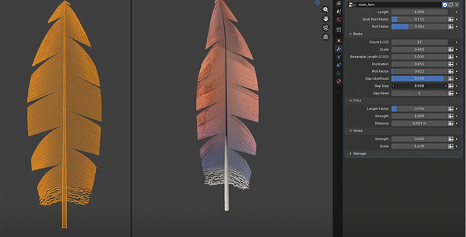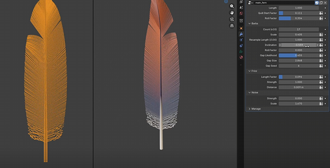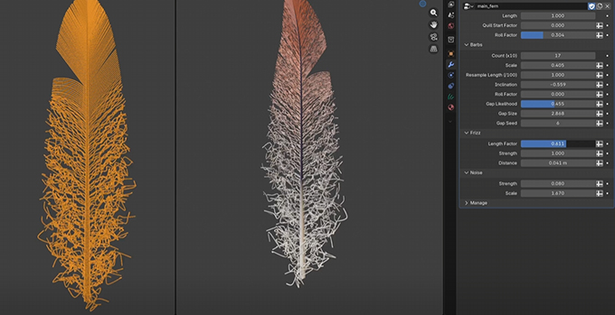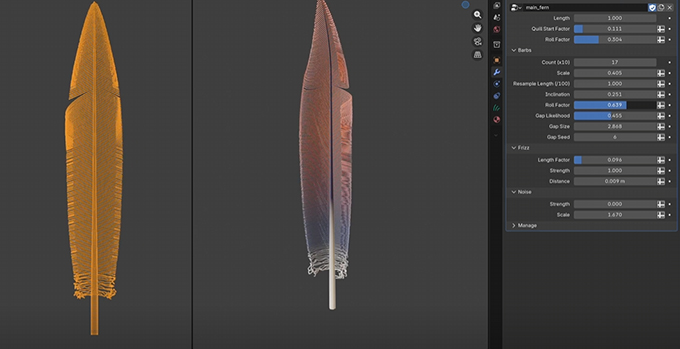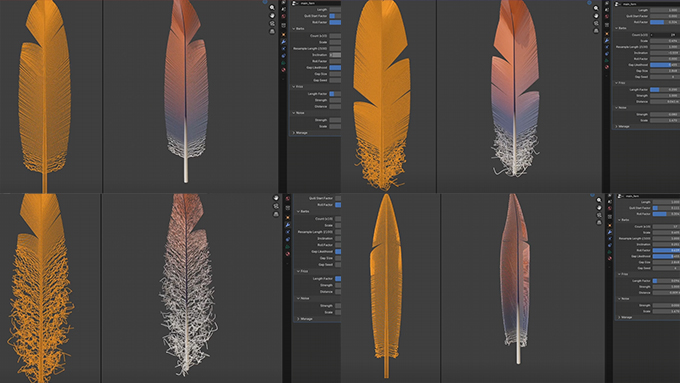 羽の長さ、ねじれ、本数、太さ、羽枝の分割数、隙間やばらつき、隙間の太さ、隙間のランダム感、自然な羽にする為の乱れや、ちぢれや等のくせ感、全体の不揃い感を追加するノイズを調整する事が出来ます。