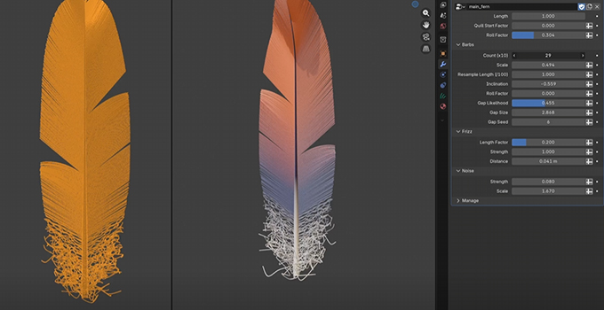 Procedural FeatherはAlex MartinelliさんがBlenderのジオメトリーノードで作成した、プロシージャルに羽の形状を作成、調整出来るモディファイアです。