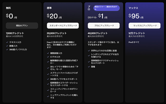 無料会員になると7,000クレジットが付与されて、テキスト、画像、360度画像から4つのシーンを作成する事が可能となりますが、現在は、最初の1ヶ月だけプロバージョンの定価35ドルを1ドルで試す事が可能で、高解像度テクスチャ付きモデルをエクスポート機能と、商用利用できる権利が付いています。