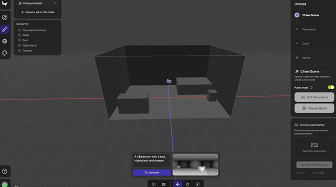 また、ブラウザ内にあるChiselツールを使用すると、3Dファイルをインポートしたり、正方形のプリミティブを配置して、テキストボックスから文字を入力する事で、簡単に室内シーンを作成する事も可能で、配置されたモデルをさらに変更する事も出来ます。