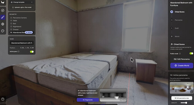 シーンを簡単に作成する事も可能。また、Panorama画像を作成した後に部分的に囲ってモデルを変更する事も出来ます。公式サイトからは様々な作成されたシーンを確認する事が出来ます。