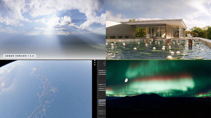 複数レイヤーの雲を重ねる事が可能になり、HDRI生成にも完全対応。フレア、ゴーストなど光学エフェクトも内蔵。