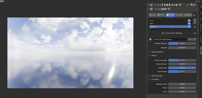空の色、光の散乱、雲の見え方、明るさの変化などがすべてリアルに動くのが特徴で、本当の大気のように見える空を作れます。
