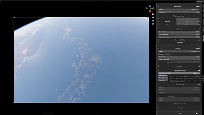 今回のアップデートでは、地上から月の軌道に近い高さまで、シーンを切り替えずに移動する事が可能で、地球の半径を1:1で実寸サイズで忠実に再現されています。また、地球の大気は約100kmありますが、その厚みを正確にシミュレーションしています。