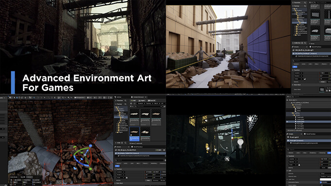 実際の写真資料をゲーム用シーンへと落とし込む方法、壁や床などの素材の作成方法、Blenderを使った瓦礫シミュレーション、Substance Painterによる実世界のステンシルを使ったテクスチャ制作まで、幅広く解説します。