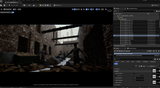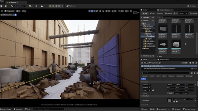 3.BlenderとZBrush を使ってモジュラーキット、瓦礫シミュレーション、物理ベースの変形処理を行い、リアルな小物や構造物を制作してUE5内で配置します。