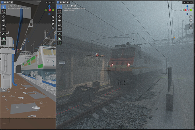 電車とホームの完成シーンデータは、BlenderのCyclesでレンダリングすると以下のように表示されて、どのような作りになっているのか参考にする事が出来ます。