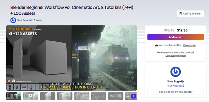 7時間越えのシネマティックシーンのチュートリアル動画に100種類のアセットが含まれて定価16.48ドルがセールで12.36ドルと激安のBlender Beginner Workflow For Cinematic Art, 2 Tutorials (7+H) + 100 Assetsを購入したので中身を確認してみました。