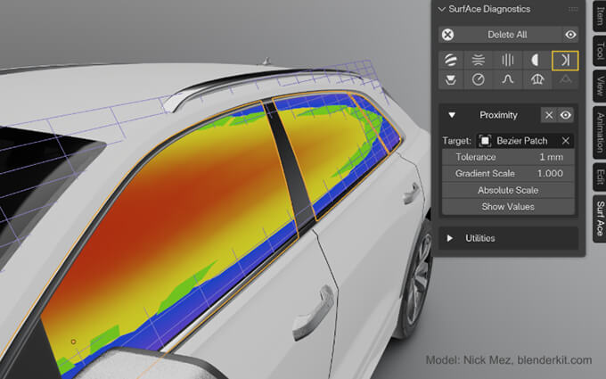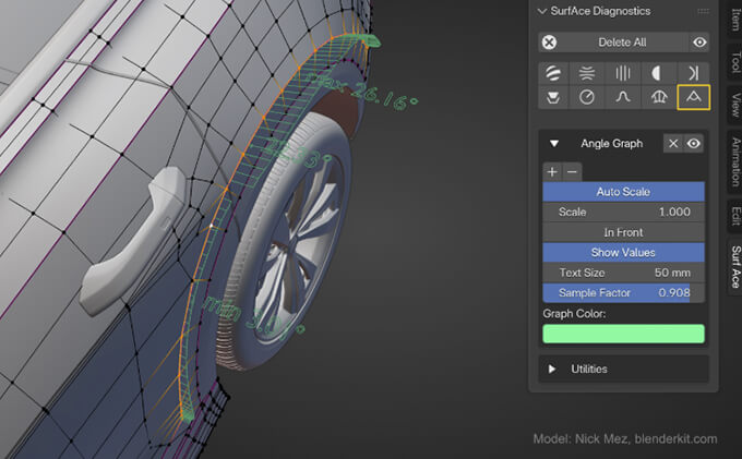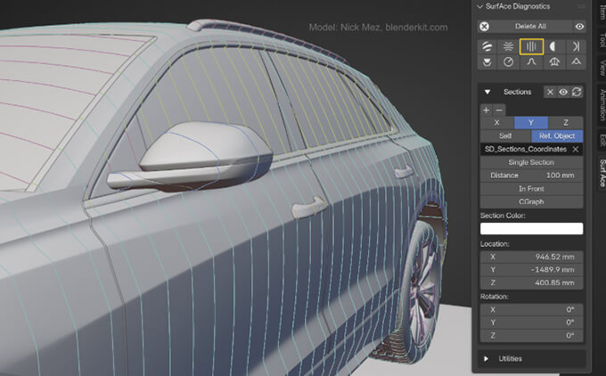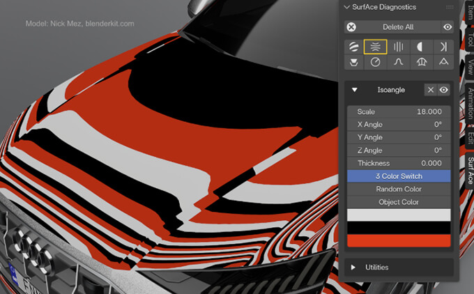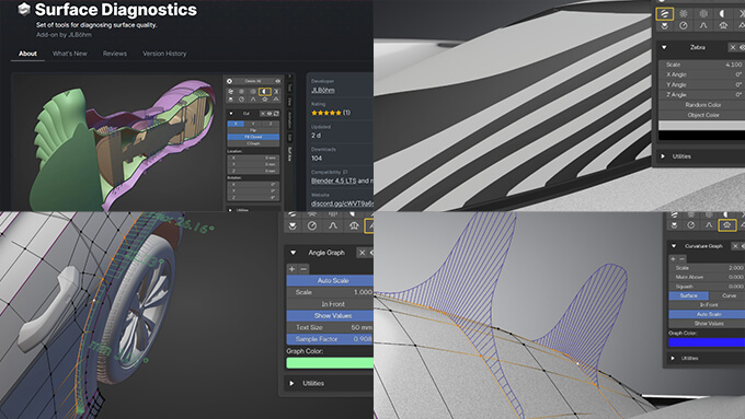 blender 有料だったBlenderでモデルの曲面を確認するアドオンSurface Diagnosticsが無料公開されています。 modelinghappy 2025年12月5日 [PR] Surface Diagnostics 以前はSUPER HIVE(旧Blender market)で15ドルで販売されていた、複雑な曲線を持つモデルの面が歪みが無く綺麗なのか確認する為の便利な機能が複数用意されているアドオンSurface DiagnosticsがBlender Extensionsに全ての機能を実装して無料で公開されています。 アドオンは、モデルにライン投影やゼブラ模様でゆがみがないか確認したり、スライスして断面形状を確認、曲率を分かりやすく表示して歪んでる部分を調整するのに役立てる事が出来ます。