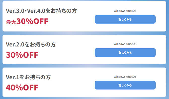 また、バージョンアップ・アップグレード版も30%オフで購入する事が可能となっています。
