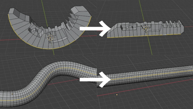 Unbend Meshは、Kushiroさんが作成した、ポリゴン形状を曲がっている状態から真っ直ぐな形に戻す、調整する事が出来るBlender用無料アドオンです。