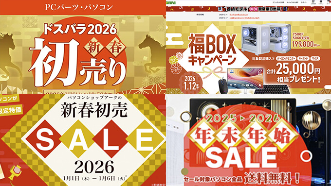 2026年1月1日よりドスパラ、TSUKUMO、STORM、アーク、パソコンショップ7 SEVEN、FRONTIERなどの日本のBTOメーカーで新春初売りセールが開催しているのでまとめてみました。