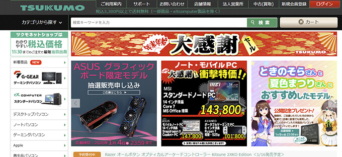 TSUKUMOでは2026年1月3日まで毎日日替わり限定でお得なパソコンパーツやペンタブレットにモニターなどをお得な価格で販売しているので既に売り切れになっている物も多数あります。
