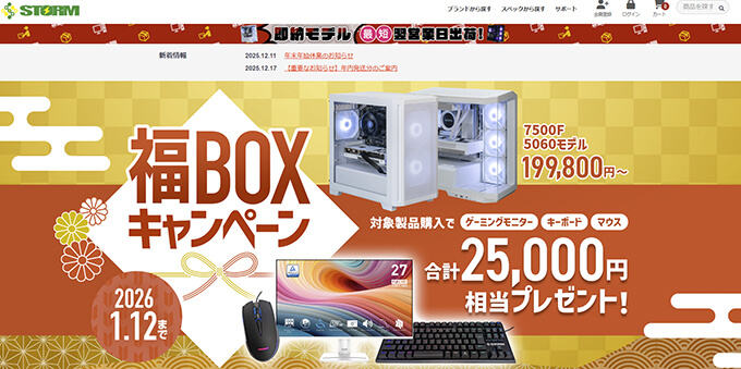 STORMでは1月12日まで、お得なパソコン、モニター、キーボード、マウスがセットになったゲーミング環境福袋を20万円~45万円で販売しています。出荷予定も7~10営業日なので購入後長期間待つ必要もないのもうれしいポイントです。