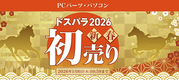 ドスパラでは2026年1月6日まで初売りセールとして、PCパーツや1ヶ月以内に届くお得な台数限定パソコンを販売しています。