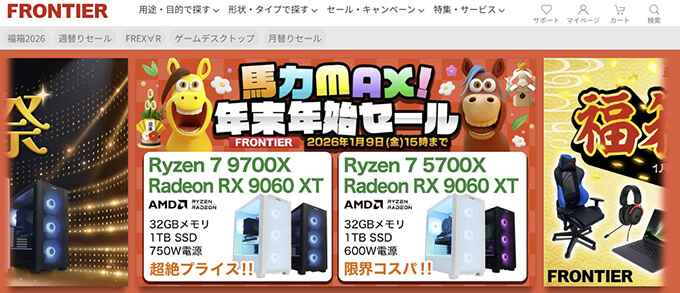 FRONTIERでは1月9日まで年末年始セールとして、お得なパソコンに、お得なゲーミングセットのパソコンが数量限定で販売されています。