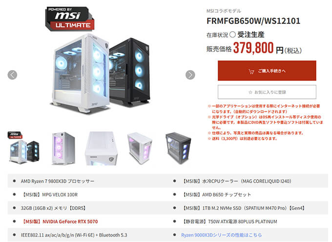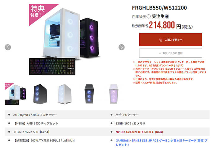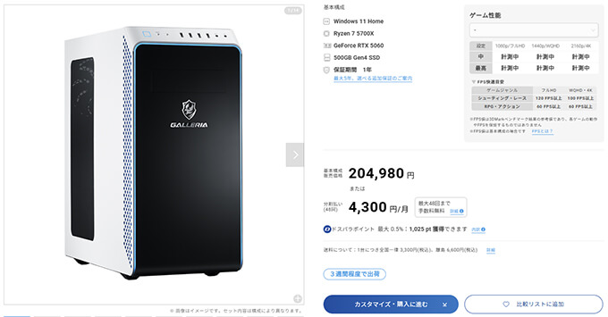 GALLERIA RA7R-R56-W 5700X搭載 台数限定モデル
