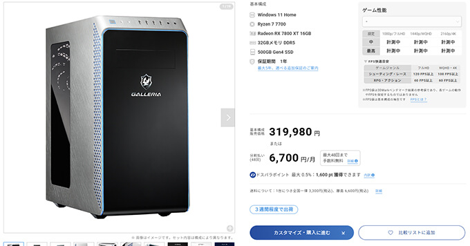 GALLERIA UA7R-78XT 7700搭載 台数限定モデル
