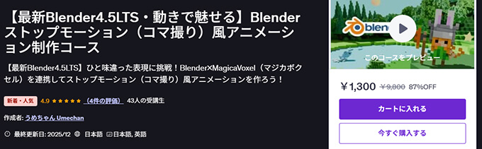 【最新Blender4.5LTS・動きで魅せる】Blenderストップモーション(コマ撮り)風アニメーション制作コース 9,800円→1,300円
