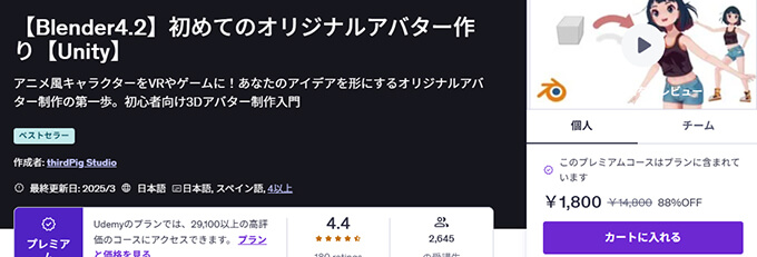 一気に難易度は上がりますが、アニメ調のキャラモデルを作成、さらに表情設定、UV展開とテクスチャ作成、VRM形式にアバター変換して実装する所まで解説してくれます。31時間の大ボリューム動画なのでセール価格も他動画より高めとなっています。