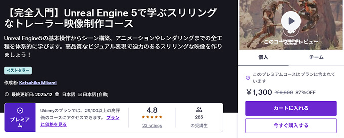 無料アセットの導入からシーン構築、ライティング、カメラワーク、アニメーション、レンダリングまで、映像制作の一連の流れを実制作形式で解説してくれます。ゲームエンジン初心者でも理解しやすい丁寧なステップ構成で、リアルタイムCGならではの表現手法を体系的に学習可能。完成作品を通じて「見せる映像」を作るための演出や画作りも身につきます。映像制作スキルをしっかり身につけたい人に向いたボリュームある講座となっています。