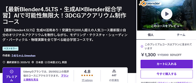 Blenderを教えるのが上手な大人気講師うめちゃん先生が、初心者の人でもつまづかないように、Blenderでモデリング、パーティクル、物理シミュレーション、テクスチャ作成などの様々なBlenderの機能を一通り触りながら魚が泳ぐアクアリウムを完成させる講座です。