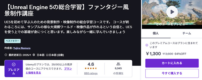 【Unreal Engine 5の総合学習】ファンタジー風景制作講座 3,600円→1,300円