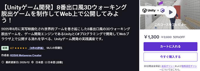 【Unityゲーム開発】8番出口風3Dウォーキング脱出ゲームを制作してWeb上で公開してみよう!2,600円→1,300円