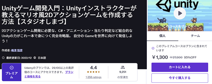 Unityゲーム開発入門:Unityインストラクターが教えるマリオ風2Dアクションゲームを作成する方法【スタジオしまづ】 27,800円→1,300円
