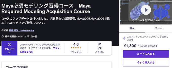 実際に私自身も、Mayaの基礎はこの動画から学びましたが、押さえるべきポイントを的確に教えてくれるため、無駄なく理解を深めることが出来て仕事に活かす事が出来ています。