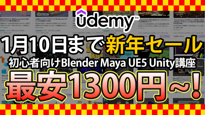 Udemy新年セール開催中!Blender・Maya・Unreal・Unity講座が1,300円~【2026年1月10日まで】
