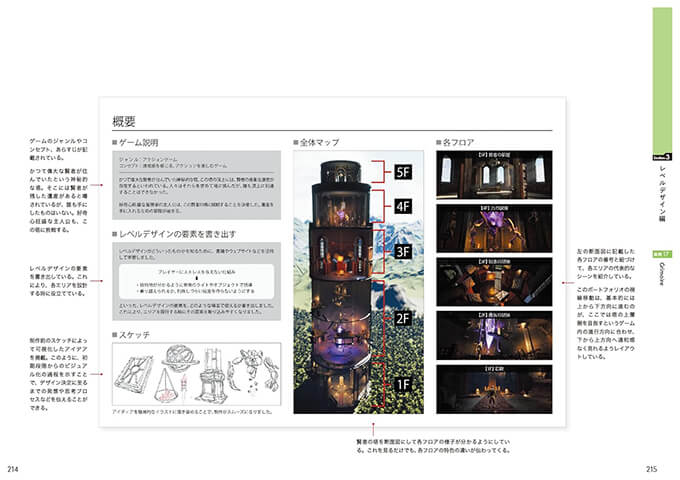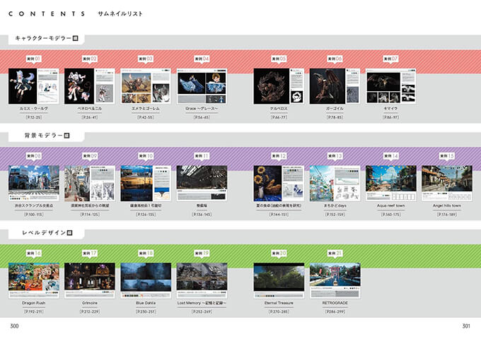 大手ゲーム会社の内定を勝ち取った21作品のポートフォリオ実例を、「キャラクターモデラー」「背景モデラー」「レベルデザイン」の3つのカテゴリに分け、現役クリエイター兼講師によるポイント解説とともに紹介される貴重な1冊となっています。
