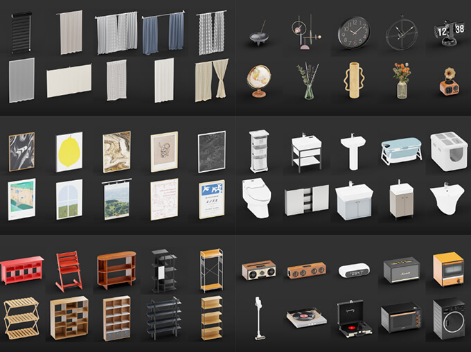 テーブル、椅子、キャビネット、棚、装飾照明、天井照明、テーブルランプ、アクセサリーなど、あらゆる素材が揃っています。すべてのアセットはスケール、軸方向、原点が標準化されていて、モデルはグループごとに分類されています。インターネットに接続することなく、ローカルでシーンにドラッグ&ドロップするだけでBlenderですぐに使用出来ます。