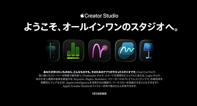 Appleが、Final Cut Pro、Logic Pro、Pixelmator Pro、Kyenote、Pages、Numbers、フリーボード、Motion、Compressor、MainStageの、10個のアプリが1つになったお得なサブスクリプションApple Creator Studioを1月29日からリリースすると発表しました。