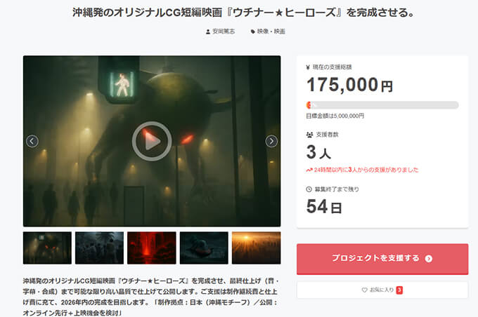 沖縄の空気感とユーモアを詰め込んだ、オリジナルCG短編映画『ウチナー★ヒーローズ』を完成させ、国内外へ届けることが目標としていて、2026年内完成目標を掲げています。