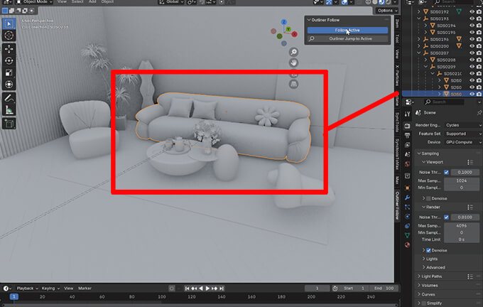 Outliner: Follow Active ObjectはBlenderで、ビュー上で選択したオブジェクトに瞬時にアウトライナーでどのモデルを選択しているのか表示してくれる無料アドオンです。