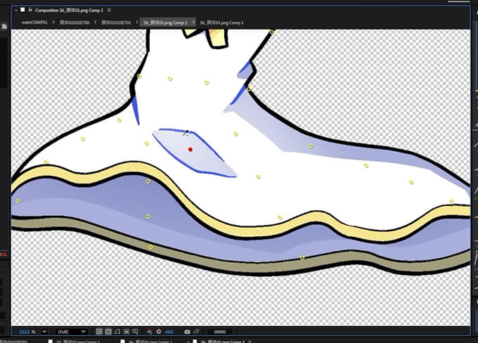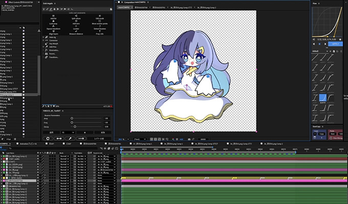入門の時と同じくAfter Effctsに素材を番号順に読み込み、コンポジション設定、パーツごとにプリコンポーズ、色分けなどをして、ボーンを組み込んでいきます。