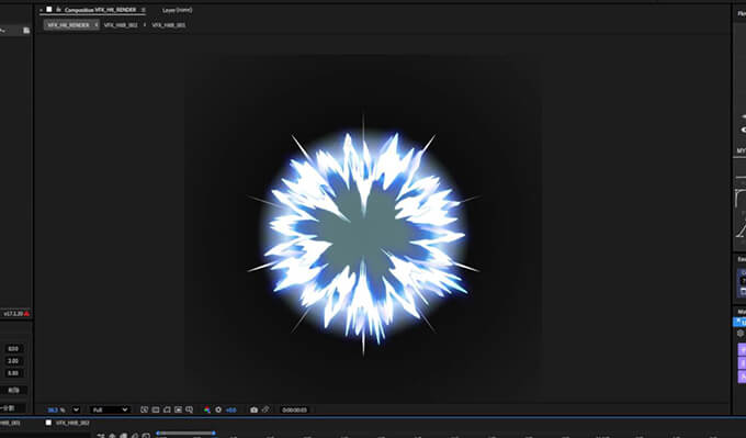 After Effectsを使用して攻撃モーション時に発生するヒットエフェクトの作成を学びます。シンプルな長方形からエフェクトを追加してギザギザのアニメーションを作成してそれを丸く形状を変更させて色にグローを追加して、完成させる方法を学びます。