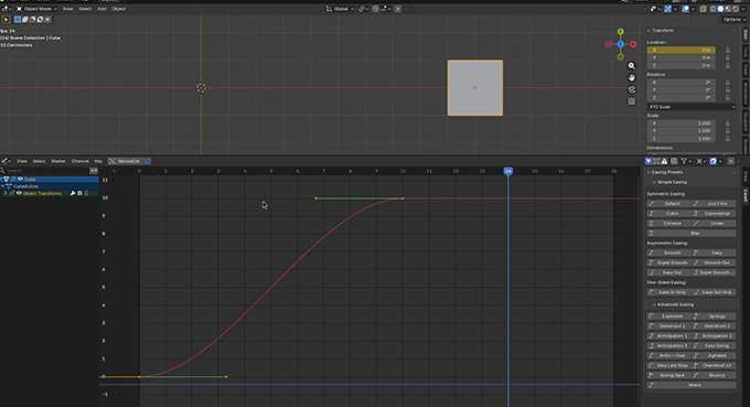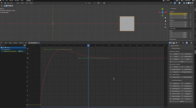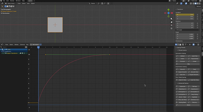 EaseitはBlenderのタイムライン/ドープシートおよびグラフエディターのキーフレームにイージングプリセットを29種類から選んで適用するとアニメーションを効率的に作成できるアドオンです。